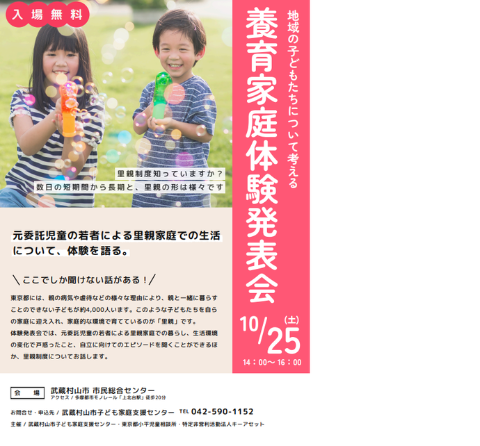 養育家庭制度の説明、養育家庭のシンポジウム(参加者:養育家庭当事者、小平児童相談所フォスタリング機関)、養育家庭の個別相談会