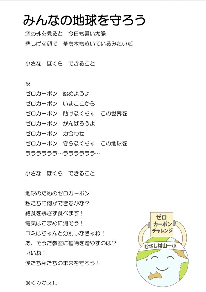 市立第一小学校において、ゼロカーボンチャレンジ校としての取り組みの一環として、先生と児童の協力によりゼロカーボンの歌「みんなの地球を守ろう」が作成されました。ぜひご覧いただき、皆様におかれましても地球温暖化対策にご協力をお願いいたします。