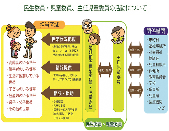 民生委員・児童委員は、地域で生活している皆さんのさまざまな悩みやお困りごとについて相談に乗るほか、高齢者や障害者の支援、子育て支援、生活上の困りごとなどに対応するなど幅広い活動を行い、地域の安心・安全な暮らしのために日々尽力しています。