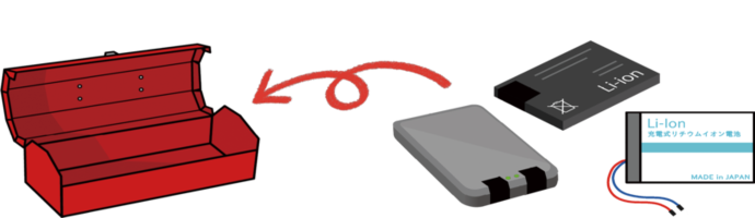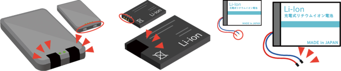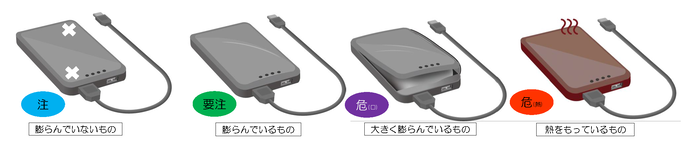 ※ モバイルバッテリー等で本体が開くほど大きく膨らんでいたり、熱を持ったりしているものは、衝撃や圧力を加えないように気を付ける必要があります。