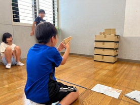 7月16日(水曜日)に段ボール射的をしました!段ボール射的とは、段ボールで作成した銃に輪ゴムを引っかけて飛ばし、的を射るゲームです。